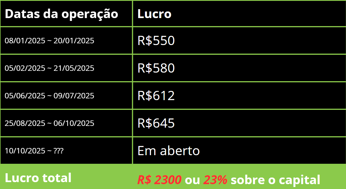 Aplicação da estratégia com R$ 10.000,00 e reinvestimento de lucros.